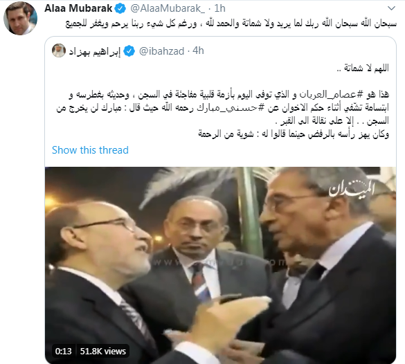 بعد فيديو مبارك لن يخرج من السجن إلا للقبر أول تعليق لـ علاء مبارك على وفاة عصام العريان Opera News