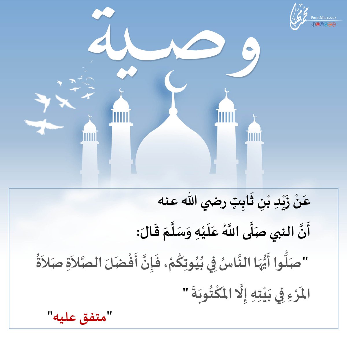 د محمد مهنا A Twitter ع ن ز ي د ب ن ث اب ت رضي الله عنه أ ن النبي ص ل ى الل ه ع ل ي ه و س ل م ق ال ص ل وا أ ي ه ا الن اس ف ي ب ي وت ك م ف إ ن أ ف ض ل الص لا ة ص لا ة الم ر ء ف ي