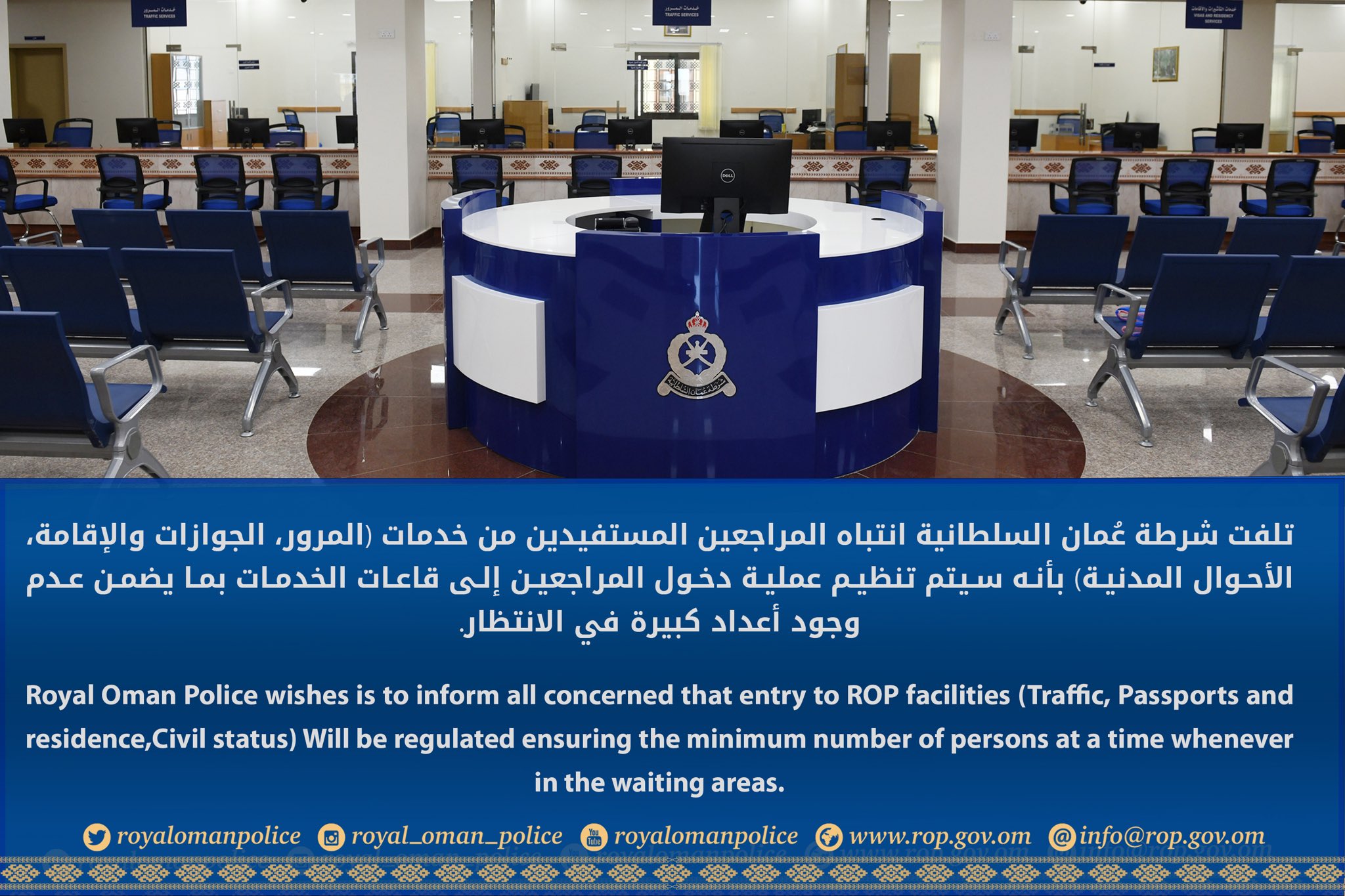 شرطة ع مان السلطانية V Twitter تلفت شرطة ع مان السلطانية انتباه المراجعين المستفيدين من خدمات المرور الجوازات والإقامة الأحوال المدنية بأنه سيتم تنظيم عملية دخول المراجعين إلى قاعات الخدمات بما يضمن عدم وجود أعداد كبيرة