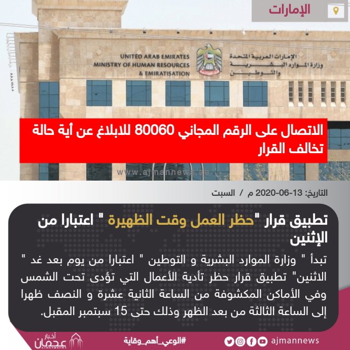 أخبار عجمان تطبيق قرار حظر العمل وقت الظهيرة اعتبارا من الإثنين الاتصال على الرقم المجاني 80060 للابلاغ عن أية حالة تخالف القرار أخبار الإمارات الإمارات الوعي أهم وقاية