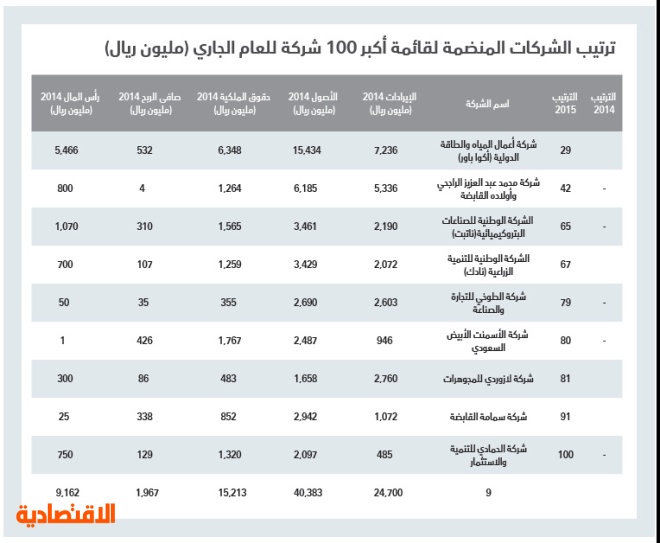 9 شركات تنضم لقائمة أكبر 100 شركة في 2015 إيراداتها 24 7 مليار صحيفة الاقتصادية
