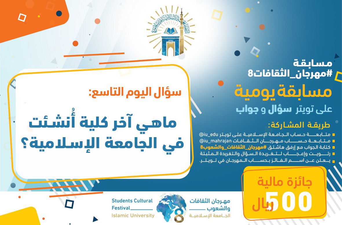 مهرجان الثقافات Iu V Twitter مسابقة مهرجان الثقافات والشعوب8 سؤال اليوم التاسع ما هي آخر كلية أ نشئت في الجامعة الإسلامية طريقة المشاركة Https T Co 5r2samixr8