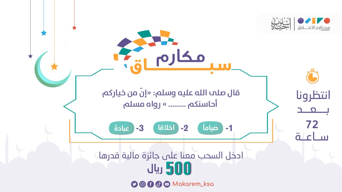 جمعية مكارم الأخلاق On Twitter سؤال سباق مكارم اليوم وجائزة قدرها 500 ريال شروط المسابقة 1 متابعة حساب الجمعية في تويتر Makarem Ksa 2 الجواب على سؤال اليوم في وسم سباق مكارم5 3 إعادة