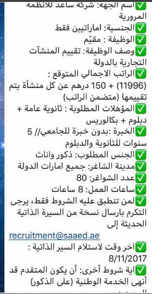 وظائف شاغره فى شركة ساعد للانظمة براتب 12000 درهم لكل المؤهلات وبخبره وبدون خبره