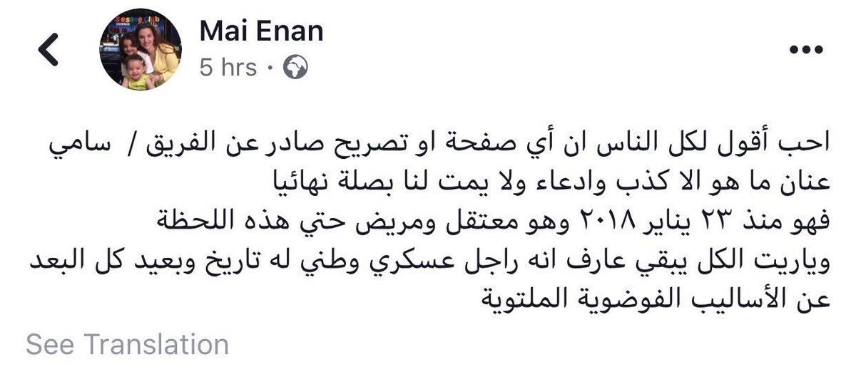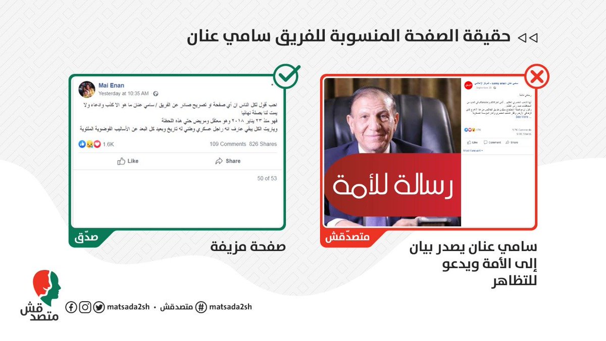 متصدقش No Twitter الصفحة دي مزيفة مي عنان ابنة الفريق سامي عنان أكدت في حسابها على فيسبوك إن أي صفحة أو تصريح صادر عن الفريق سامي عنان ما هو إلا كذب وادعاء