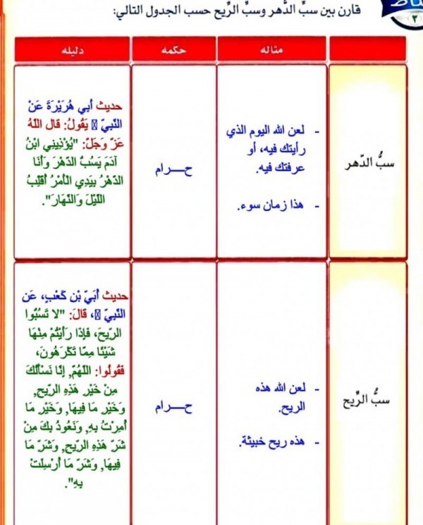 قارن بين سب الدهر وسب الريح حسب الجدول التالي سؤال وجواب