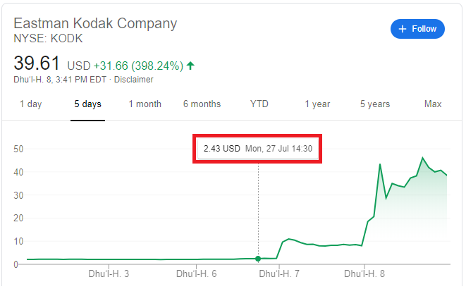 إيـاد الحمود On Twitter قبل 48 ساعة كان سعر سهم شركة كوداك 2 5 دولار فقط الآن وصل سعره إلى 40 دولار أي أنك لو اشتريت أسهم فيها بـ 100 ألف ريال ستصبح