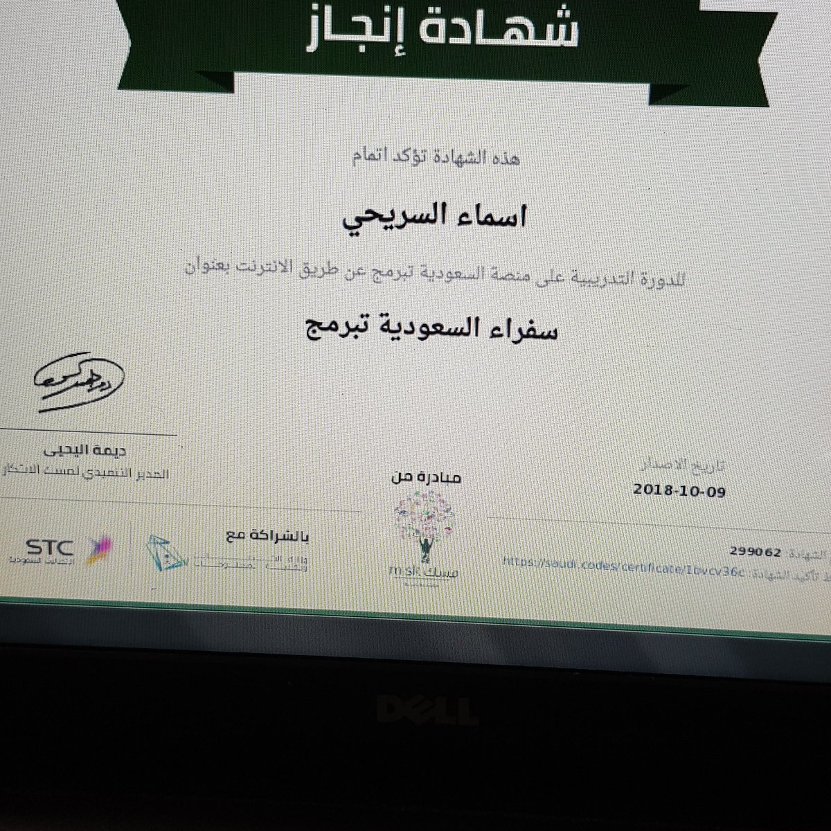 اسماء No Twitter يارب لك الحمد والشكر حصلت على شهادة سفراء السعودية تبرمج بعد دراسة واجتياز اختبار لاربعة مراحل في لغات البرمجة المختلفه واشجع الجميع بالتسجيل بالموقع الخاص بهم والدراسة من خلال الفيديوهات