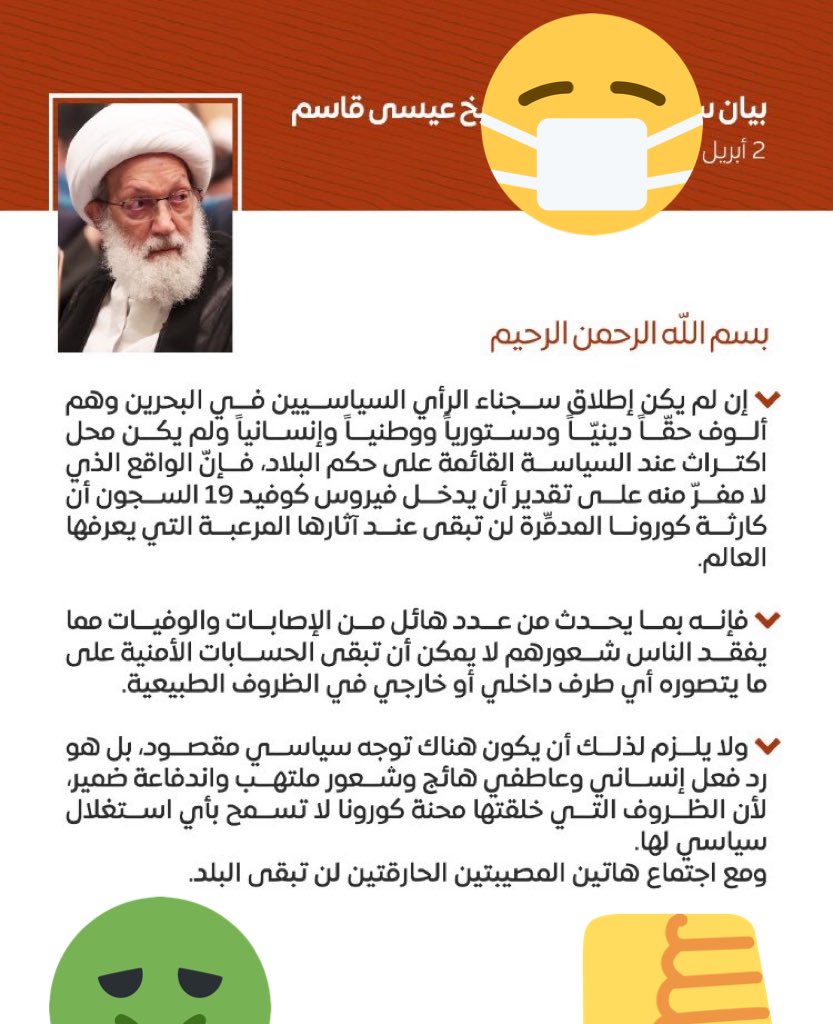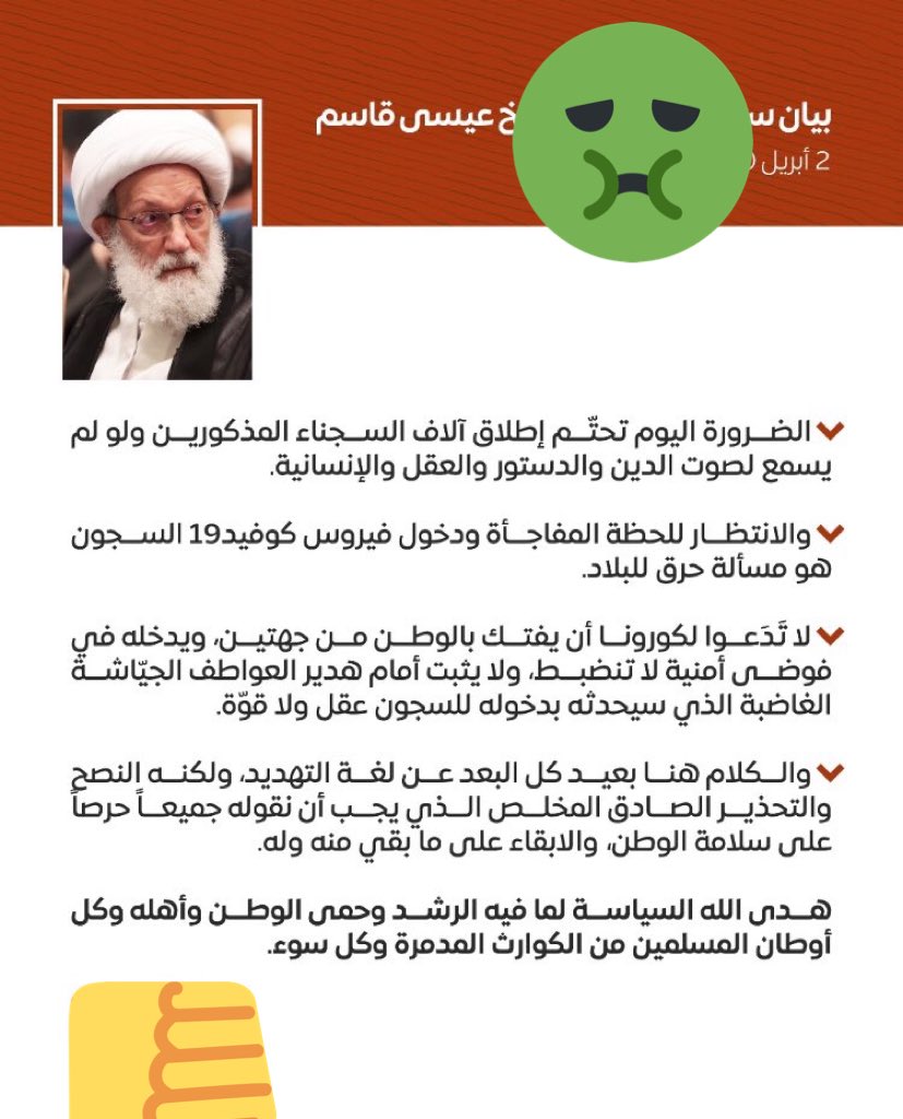 فارسة المحرق 55 العراق A Twitter المال القطري الايراني شغال بعد تصدر مملكة البحرين المشهد العالمي في مكافحة فيروس كورونا البوق الايراني المدعو عيسى قاسم الذي يدعم ارهاب قتل الابرياء ورجال