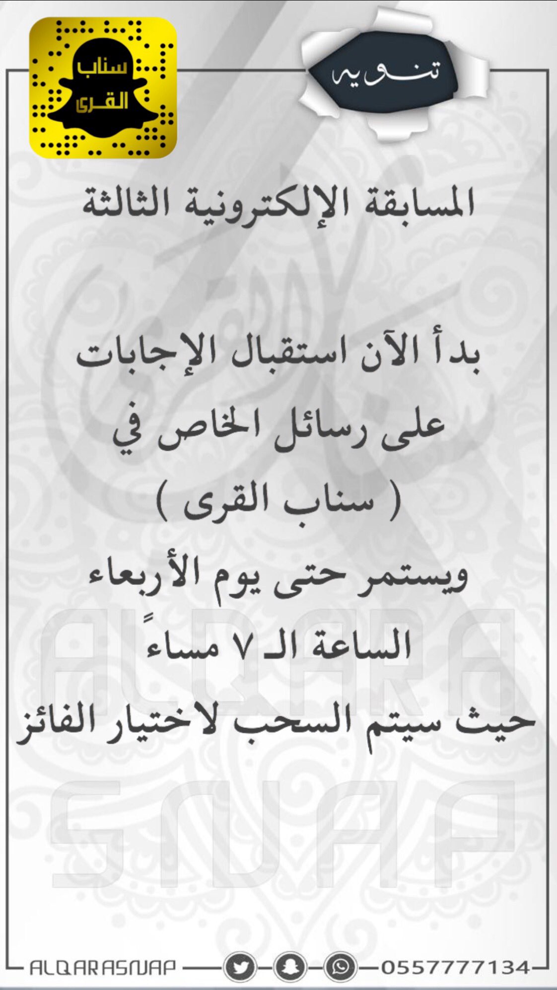 سـ نـ ـاب الـ ـقـ ـرى A Twitteren انطلاق المسابقة الإلكترونية الثالثة المقدمة من لجنة التنمية بالأطاولة وبلدية القرى والمجلس البلدي بالقرى وبدأ الآن استقبال الإجابات على رسائل الخاص في