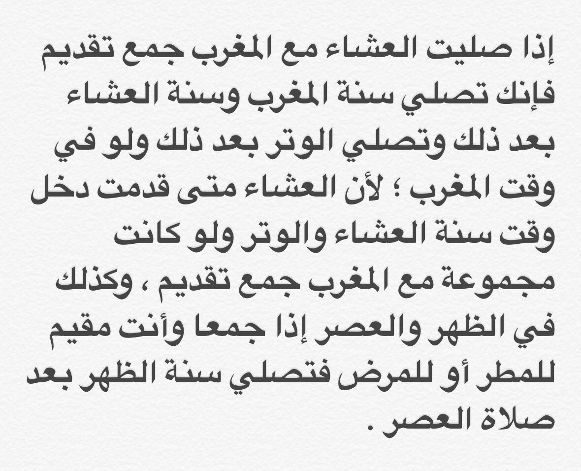 مسلم الزامل على تويتر اذا جمعنا صلاة المغرب والعشاء في المسجد لوجود مطر متى نصلي الرواتب وهل نصلى الشفع والوتر في نفس الوقت أم لابد من تأخيرها جواب الشيخ بن