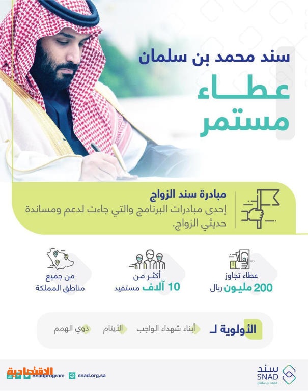 أطلق برنامج سند محمد بن سلمان اليوم مبادرة سند الزواج وهي مبادرة اجتماعية مخصصة للمتزوجين حديث ا لتخفيف أعباء الزواج وتعزيز الوعي المعرفي بآليات مبتكرة. 3 ويمكن الوصول إلى رابط التقديم على سند الزواج عبر الرابط من هنا. التسجيل في سند للزواج 1440.