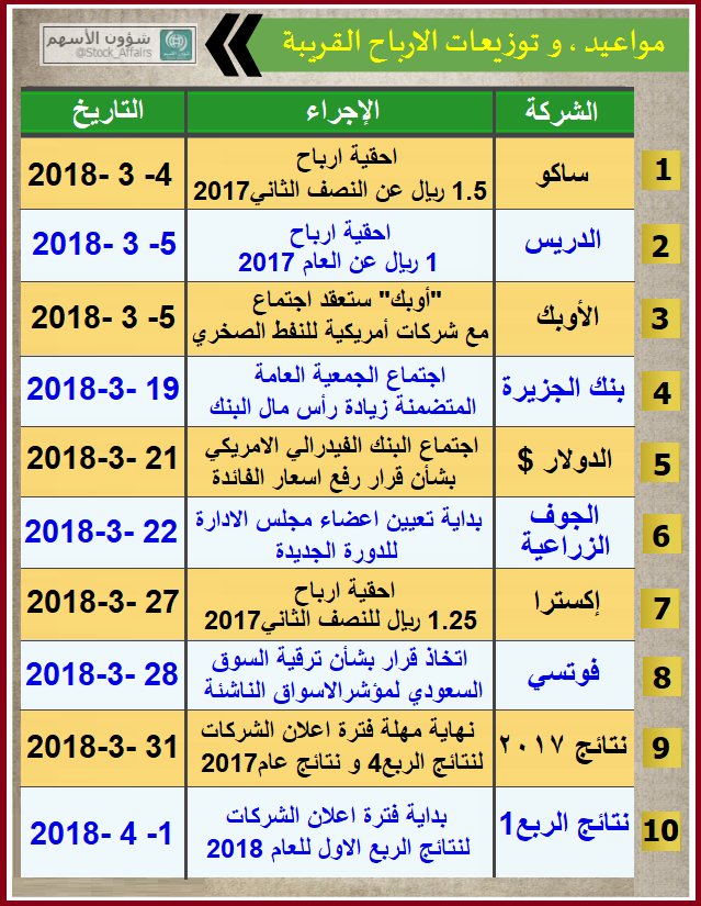 شؤون الأسهم On Twitter مواعيد و توزيعات قريبة سهم ساكو سهم الدريس منظمة الاوبك سهم بنك الجزيره اسعار الفائده على الدولار سهم الجوف الزراعيه سهم اكسترا مؤشر فوتسي
