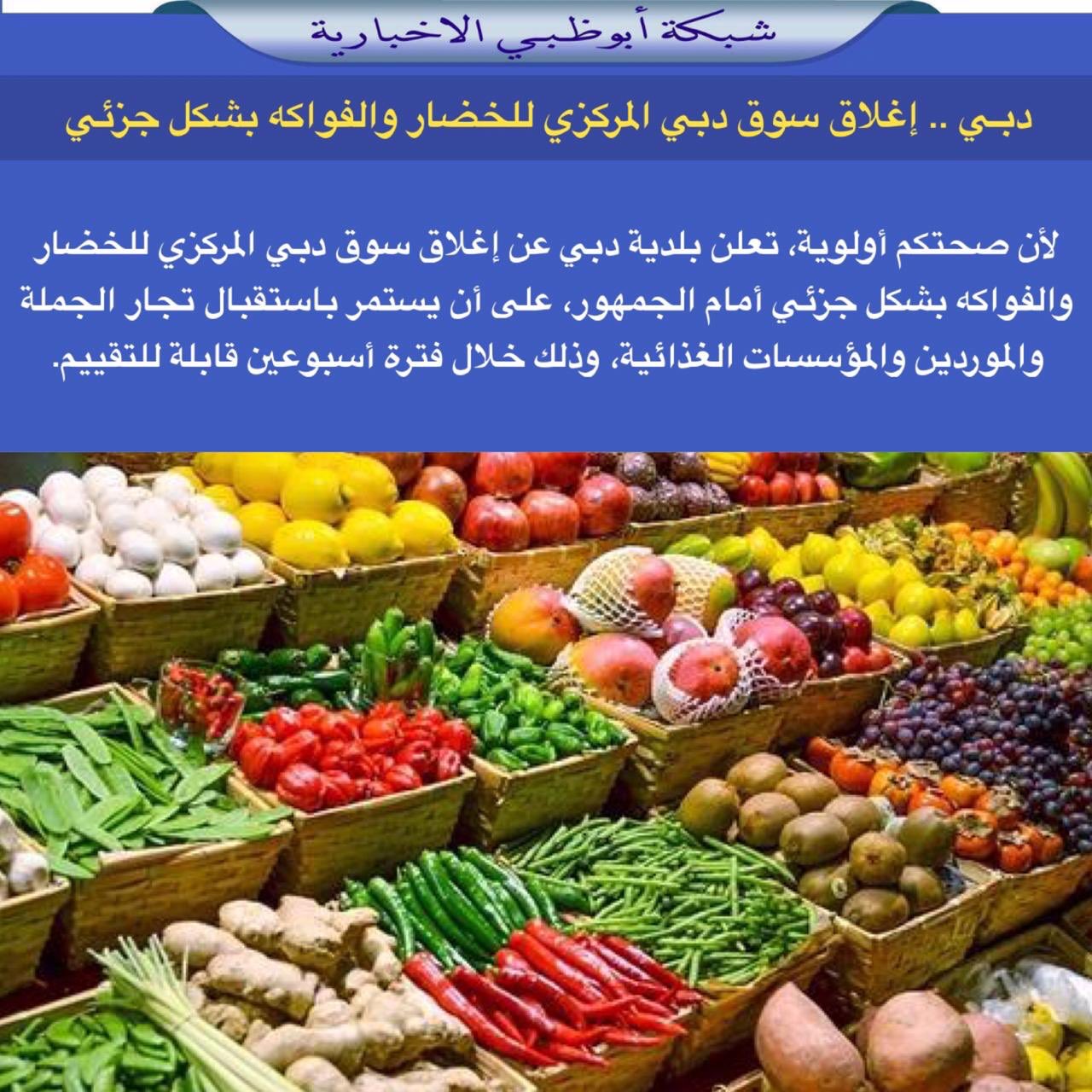 شبكة أبوظبي Na Twitteru لأن صحتكم أولوية تعلن بلدية دبي عن إغلاق سوق دبي المركزي للخضار والفواكه بشكل جزئي أمام الجمهور على أن يستمر باستقبال تجار الجملة والموردين والمؤسسات الغذائية وذلك خلال