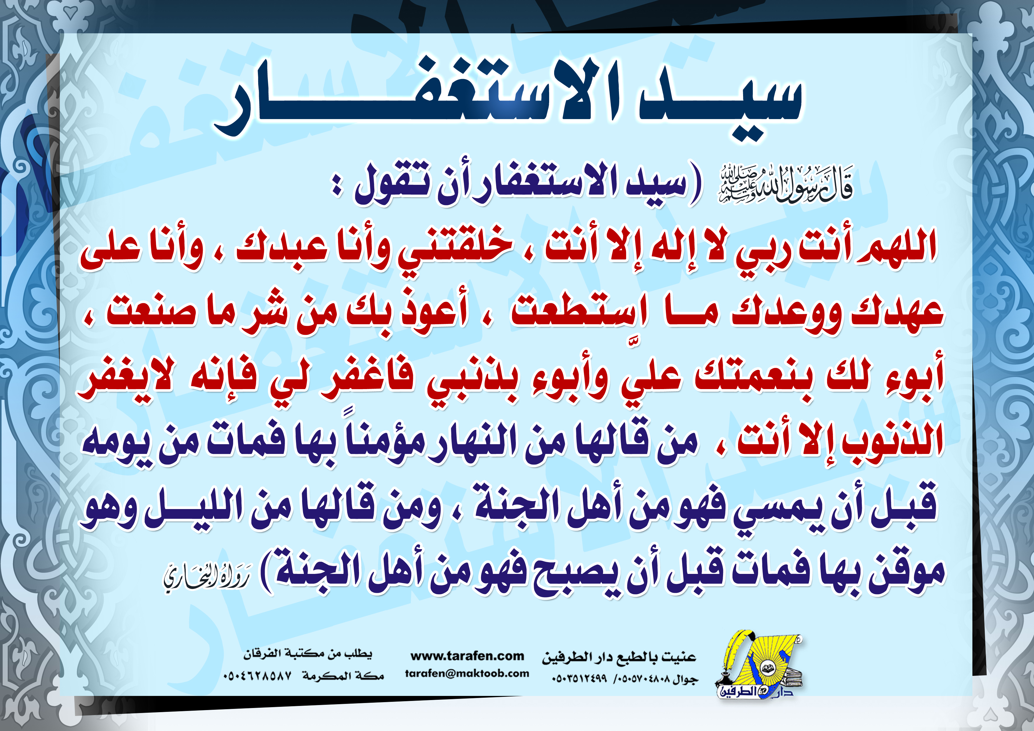 سيد الاستغفار مكرر عن ش د اد ب ن أ و س رضي الل ه عن ه عن الن ب ي ص ل ى الله ع ل ي ه وس ل م قال. المعاني التي يحملها سي د الاستغفار. لما كان هذا الدعاء جامعا لمعاني التوبة كلها استعير له اسم السيد وهو في الأصل الرئيس الذي يقصد في الحوائج ويرجع إليه في الأمور.