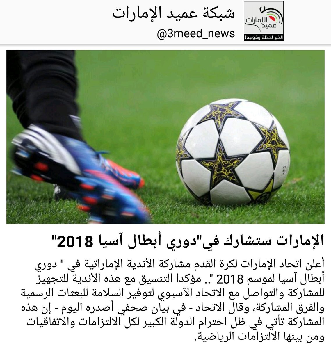 شبكة عميد الإمارات On Twitter أعلن اتحاد الإمارات لكرة القدم مشاركة الأندية الإماراتية في دوري أبطال آسيا لموسم 2018 مؤكدا التنسيق مع هذه الأندية للتجهيز للمشاركة والتواصل مع الاتحاد الآسيوي