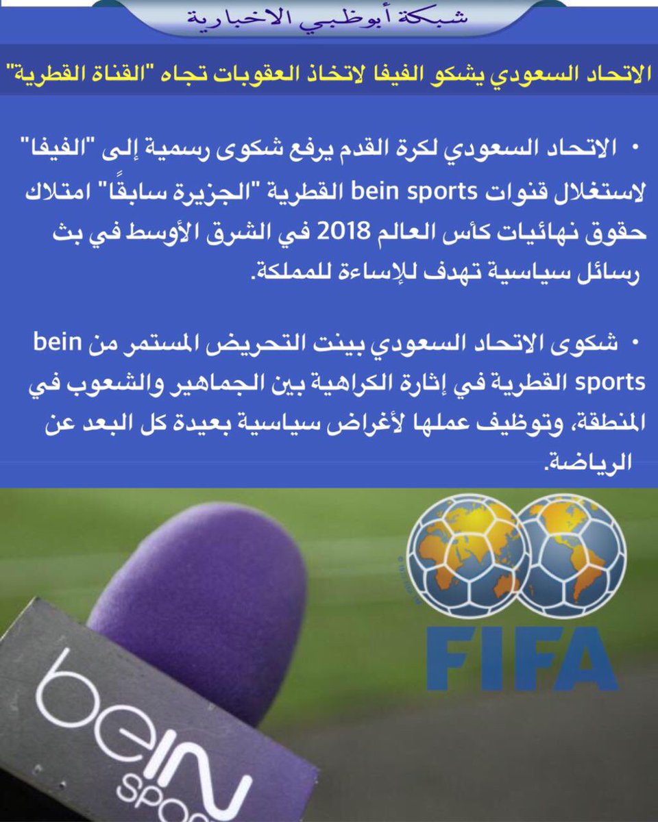شبكة أبوظبي على تويتر الاتحاد السعودي يشكو الفيفا لاتخاذ العقوبات تجاه القناة القطرية