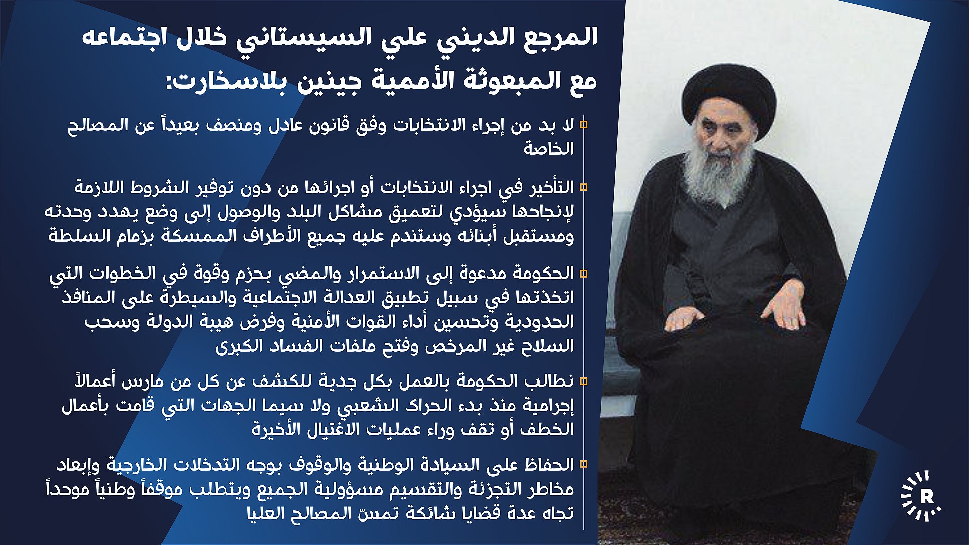 موقع رووداو السيستاني يخرج عن صمته ببيان يلخص موقفه من القضايا السياسية الراهنة ويوجه عدة مطالب لحكومة الكاظمي