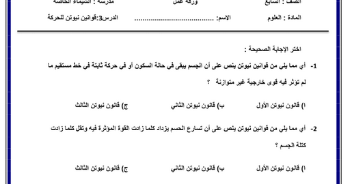 ورقة عمل قوانين نيوتن للحركة في العلوم للصف السابع الفصل الاول