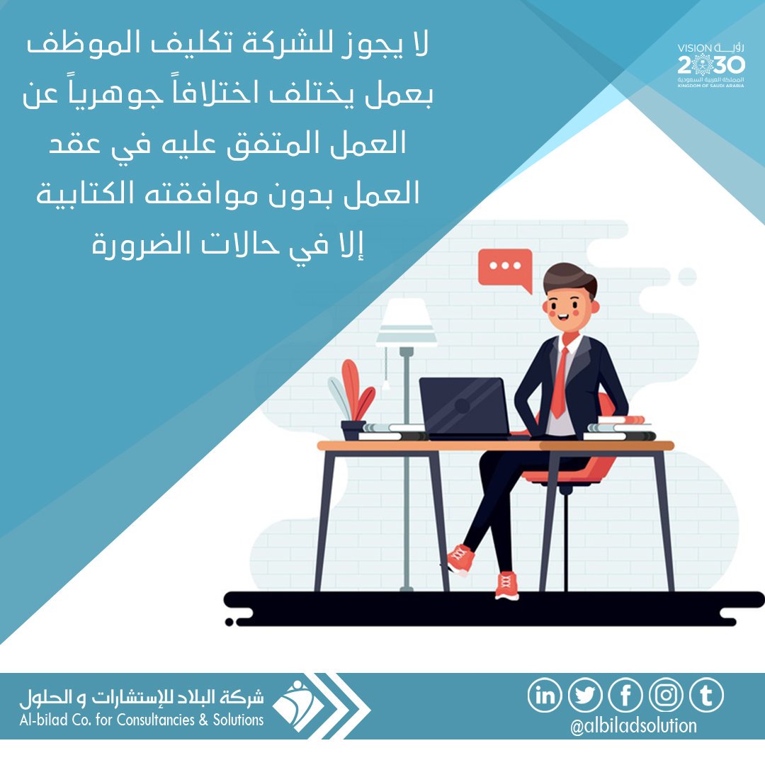 شركة البلاد للإستشارات والحلول On Twitter لا يجوز للشركة تكليف الموظف بعمل يختلف اختلافا جوهريا عن العمل المتفق عليه في عقد العمل بدون موافقته الكتابية إلا في حالات الضرورة وما تقتضيه مصلحة العمل على أن