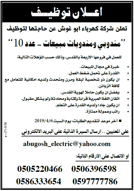 مندوبو مبيعات عدد 10 شركة كهرباء ابو غوش القدس