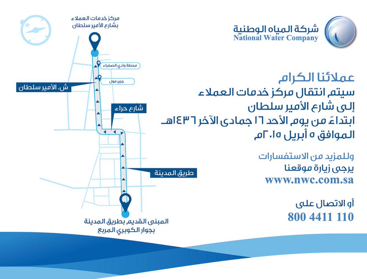 شركة المياه الوطنية بجدة شارع الامير سلطان. أعلنت شركة المياه الوطنية إطلاقها خدمة موعد لحجز مواعيد. الجزيرة سلطان المواش دشن رئيس مجلس إدارة شركة المياه الوطنية المهندس عبدالله بن عبدالرحمن الحصين وأعضاء مجلس الإدارة أمس فرع شركة المياه الوطنية في مدينة جدة والذي يقع في شارع الأمير محمد بن عبدالعزيز التحلية. أعلنت شركة المياه الوطنية عن توفر 11 وظائف شاغرة هندسية للرجال للعمل بجدة والطائف بمسمى مهندس مدني مهندس كهربائي مهندس ميكانيكي مهندس نظم عبر تمهير للتدريب على رأس العمل وذلك لبقية التفاصيل طريقة التقديم.