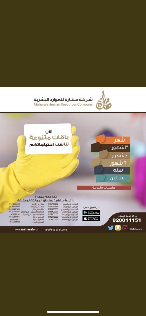شركة مهارة للموارد البشرية On Twitter عرض شهر رمضان 5 زيارات مجانا عند التعاقد على باقة الشهرين لخدمات العاملة المنزلية بنظام الساعة اطلب الآن عبر أحد قنواتنا التالية الآيفون Https T Co Eqcb2jnmoc