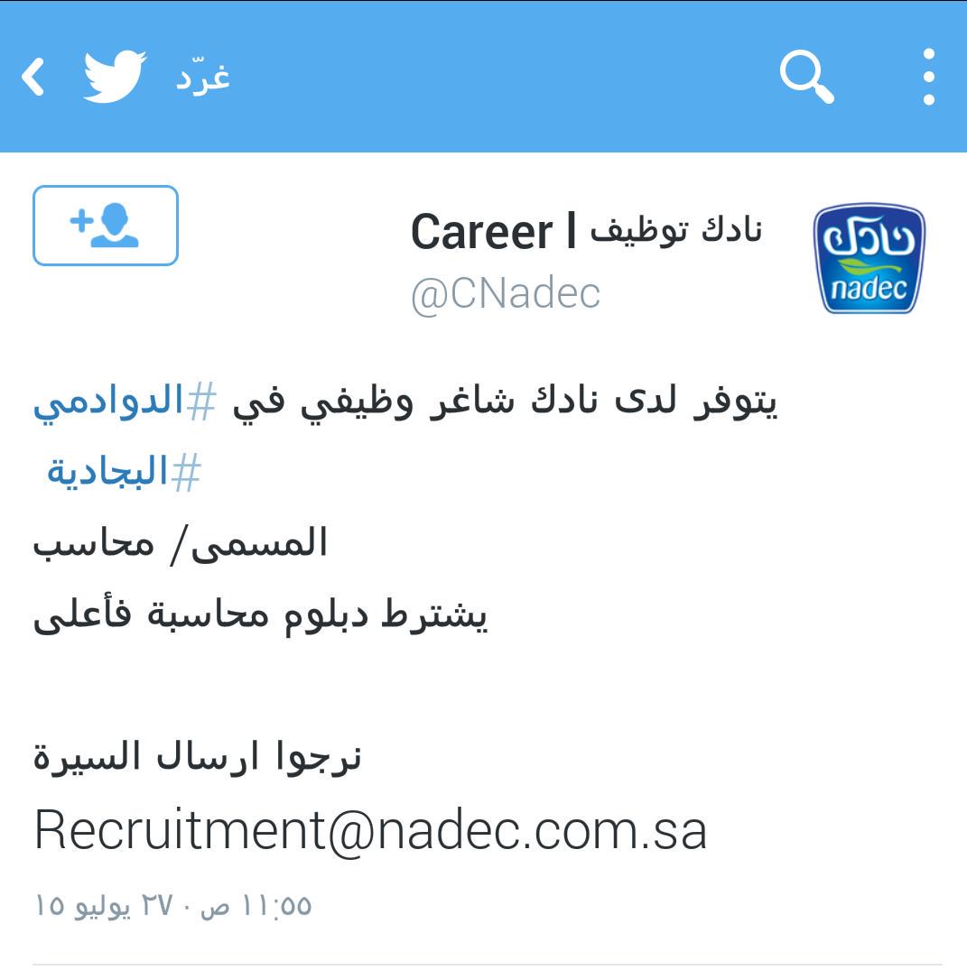 سامي النفيعي V Twitter شركة نادك فرع البجادية و الدوادمي تعلن عن وظيفة محاسب همتكم يا شباب وبالتوفيق Cnadec Http T Co Iczprd1jfw