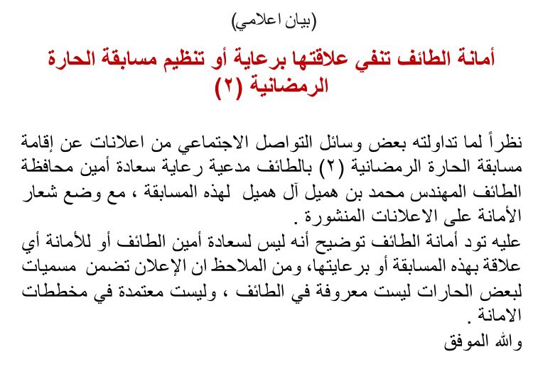 أمانة الطائف Sur Twitter بيان إعلامي أمانة الطائف تنفي علاقتها برعاية أو تنظيم مسابقة الحارة الرمضانية 2